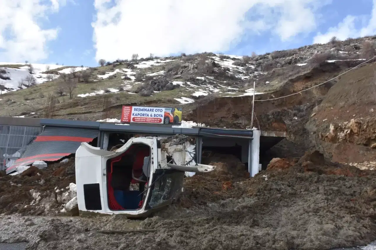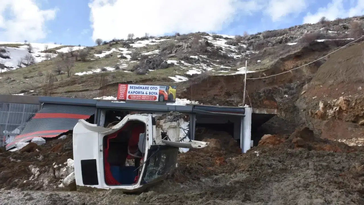 Haber Özeti: Bitlis Saray Mahallesi'nde kar erimesi ve sağanak yağış tetiklemesiyle meydana gelen heyelanda iş yerleri ağır hasar gördü; ancak bölgenin saatler önce boşaltılması büyük bir faciayı engelledi.