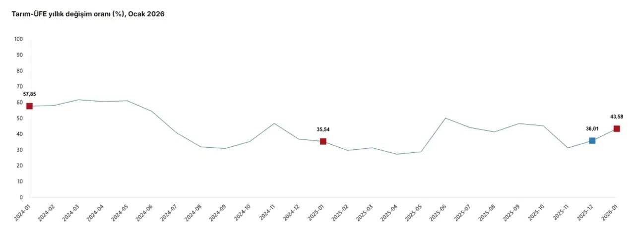 Haber Özeti: Tarım ürünleri üretici fiyatları (Tarım-ÜFE) Ocak 2026'da aylık bazda yüzde 8,46, yıllık bazda ise yüzde 43,58 oranında yükselerek gıda enflasyonu üzerindeki baskıyı artırdı. Özellikle yumuşak ve sert çekirdekli meyvelerdeki yıllık artışın yüzde 100 sınırını aşarak yüzde 109,71'e ulaşması üretici maliyetlerindeki değişimin boyutunu gözler önüne seriyor.